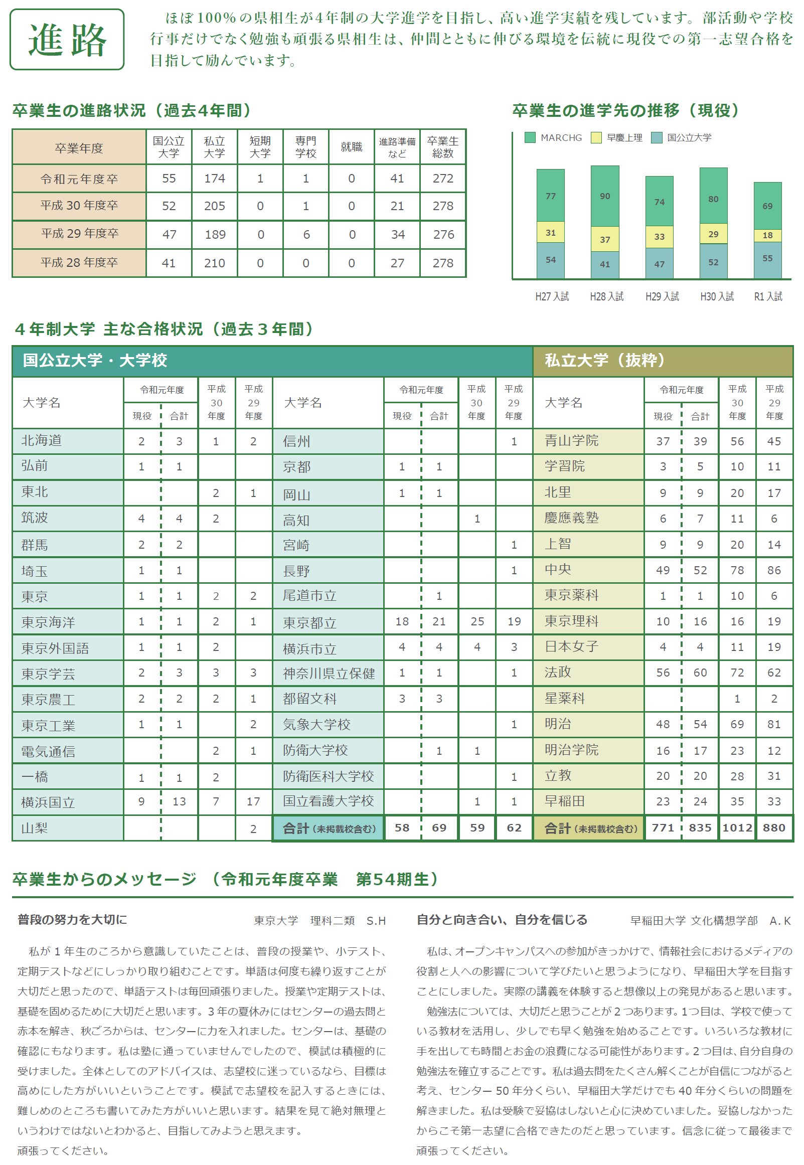 | 全般 | 空欄は0人とは限らない。このため、「開校以来初」「xx年以来」「学校史において唯一」などの見方は必ずしも正しくない。大学発表の情報を優先させた結果、各高校がまとめた数字とは異なる場合がある。各大学に関する下記の記述はあくまで原則であり、個別に調査を行い補完している場合もある。 |